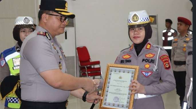 Penghargaan diberikan oleh Kapolres OKU AKBP Endro Aribowo kepada Kasat Lantas AKP Ayu Tiara Okta Dita dan enam personel, termasuk Kanit Gakkum Ipda Wibowo Pebrianto.