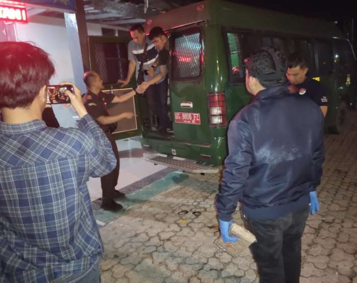Petugas mengeluarkan 23 tahanan dalam kondisi terborgol satu per satu menuju pintu masuk.